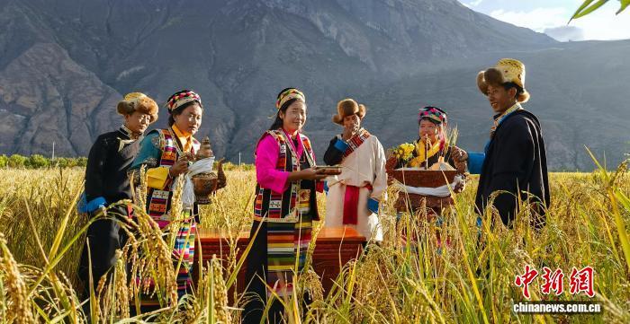 图为共康村村民在水稻收割前举行仪式。图片来源:赵岩。